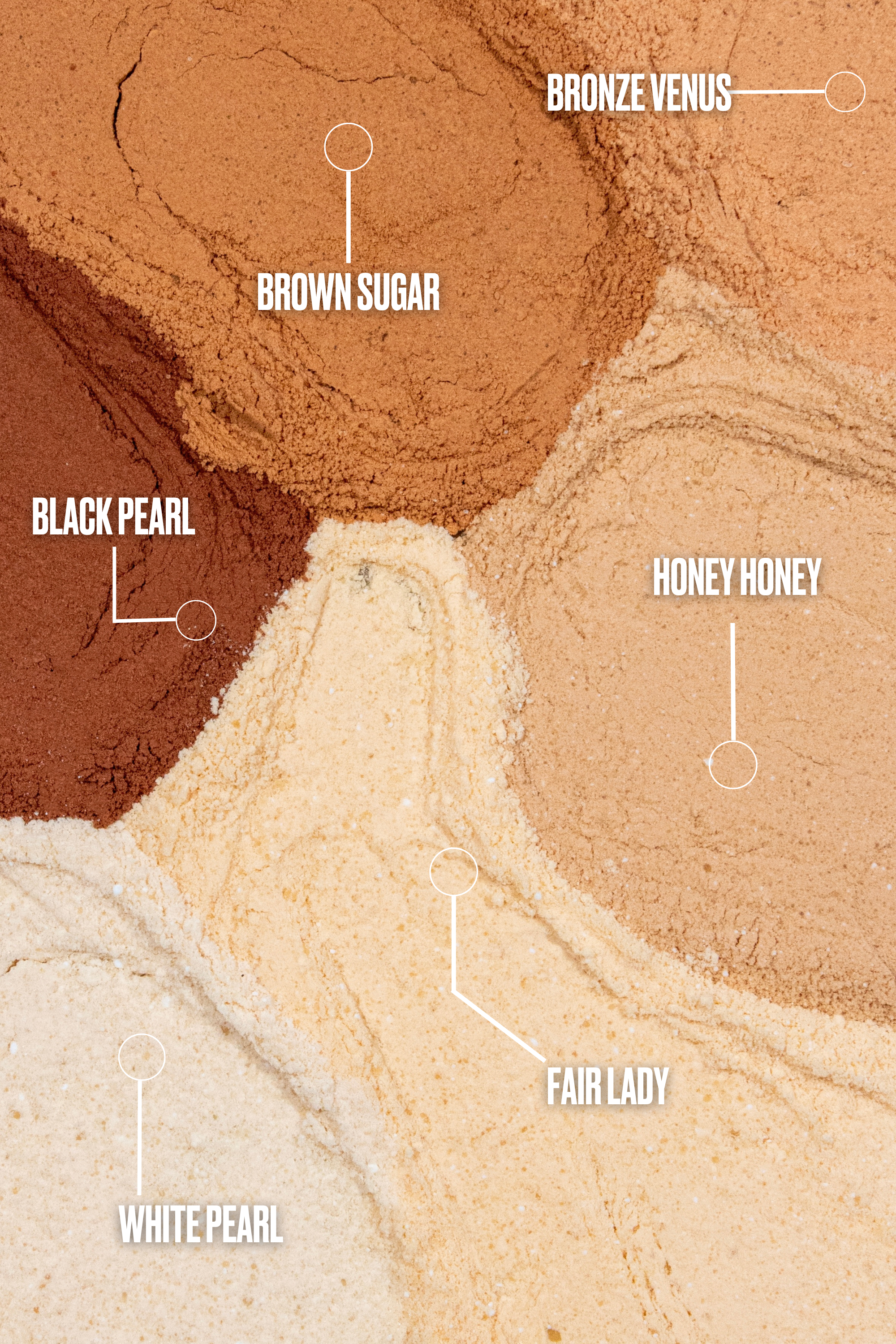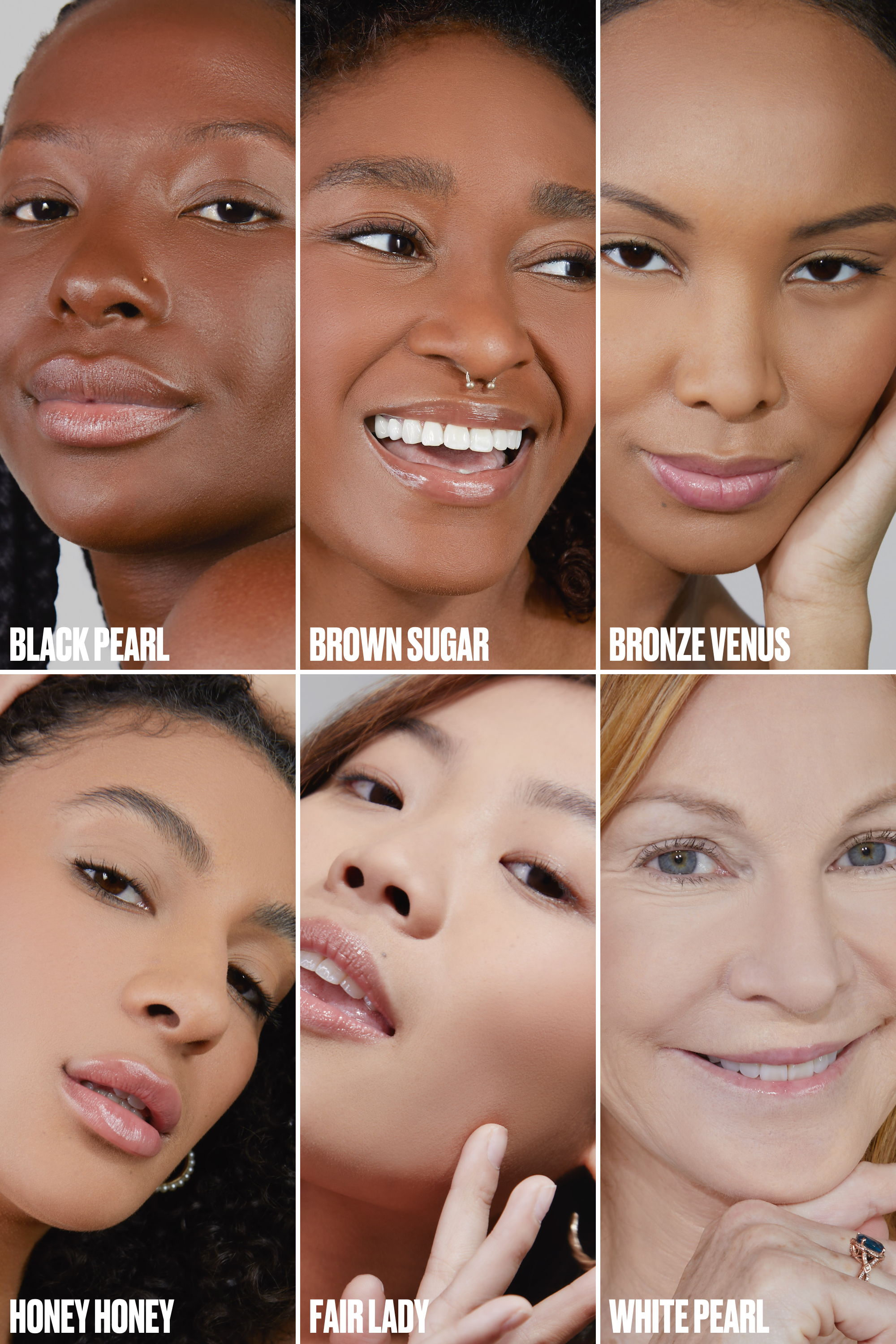 (White Pearl, Fair Lady): AQUA (WATER), DIMETHICONE/VINYL DIMETHICONE CROSSPOLYMER, GLYCERIN, HDI/TRIMETHYLOL HEXYLLACTONE CROSSPOLYMER, SILICA/DIMETHICONE SILYLATE, NIACINAMIDE, SILICA, HYDROXYACETOPHENONE, POTASSIUM SORBATE, SODIUM BENZOATE, SYNTHETIC FLUORHLOGOPITE, PHENOXYETHANOL, DEHYDROACETIC ACID, ISOCETETH-10, PROPANEDIOL, HYDROLYZED HYALURONIC ACID, MICA, TRIETHOXYCAPRYLYSILANE, (FOMES OFFICINALIS (MUSHROOM) EXTRACT). MAY CONTAIN (+/-) CI 77492 (IRON OXIDES), CI 77491 (IRON OXIDES), 77499 (IRON OXIDES). (Honey Honey): AQUA (WATER), DIMETHICONE/VINYL DIMETHICONE CROSSPOLYMER, GLYCERIN, HDI/TRIMETHYLOL HEXYLLACTONE CROSSPOLYMER, SILICA/DIMETHICONE SILYLATE, NIACINAMIDE, SILICA, HYDROXYACETOPHENONE, POTASSIUM SORBATE, SODIUM BENZOATE, SYNTHETIC FLUORHLOGOPITE, PHENOXYETHANOL, DEHYDROACETIC ACID, ISOCETETH-10, PROPANEDIOL, MICA, HYDROLYZED HYALURONIC ACID, TRIETHOXYCAPRYLYSILANE, (FOMES OFFICINALIS (MUSHROOM) EXTRACT). MAY CONTAIN (+/-) CI 77492 (IRON OXIDES), CI 77491 (IRON OXIDES), 77499 (IRON OXIDES). (Bronze Venus): AQUA (WATER), DIMETHICONE/VINYL DIMETHICONE CROSSPOLYMER, GLYCERIN, HDI/TRIMETHYLOL HEXYLLACTONE CROSSPOLYMER, SILICA/DIMETHICONE SILYLATE, NIACINAMIDE, SILICA, HYDROXYACETOPHENONE, POTASSIUM SORBATE, SODIUM BENZOATE, SYNTHETIC FLUORHLOGOPITE, PHENOXYETHANOL, DEHYDROACETIC ACID, ISOCETETH-10, MICA, TRIETHOXYCAPRYLYSILANE, PROPANEDIOL, HYDROLYZED HYALURONIC ACID, (FOMES OFFICINALIS (MUSHROOM) EXTRACT). MAY CONTAIN (+/-) CI 77492 (IRON OXIDES), CI 77491 (IRON OXIDES), 77499 (IRON OXIDES). (Brown Sugar): AQUA (WATER), GLYCERIN, DIMETHICONE/VINYL DIMETHICONE CROSSPOLYMER, HDI/TRIMETHYLOL HEXYLLACTONE CROSSPOLYMER, SILICA/DIMETHICONE SILYLATE, NIACINAMIDE, SILICA, HYDROXYACETOPHENONE, POTASSIUM SORBATE, SODIUM BENZOATE, SYNTHETIC FLUORHLOGOPITE, PHENOXYETHANOL, DEHYDROACETIC ACID, ISOCETETH-10, MICA, TRIETHOXYCAPRYLYSILANE, PROPANEDIOL, HYDROLYZED HYALURONIC ACID, (FOMES OFFICINALIS (MUSHROOM) EXTRACT). MAY CONTAIN (+/-) CI 77492 (IRON OXIDES), CI 77491 (IRON OXIDES), 77499 (IRON OXIDES). (Black Pearl): AQUA (WATER), GLYCERIN, HDI/TRIMETHYLOL HEXYLLACTONE CROSSPOLYMER, DIMETHICONE/VINYL DIMETHICONE CROSSPOLYMER, SILICA/DIMETHICONE SILYLATE, NIACINAMIDE, SILICA, HYDROXYACETOPHENONE, POTASSIUM SORBATE, SODIUM BENZOATE, SYNTHETIC FLUORHLOGOPITE, PHENOXYETHANOL, DEHYDROACETIC ACID, MICA, ISOCETETH-10, TRIETHOXYCAPRYLYSILANE, PROPANEDIOL, HYDROLYZED HYALURONIC ACID, (FOMES OFFICINALIS (MUSHROOM) EXTRACT). MAY CONTAIN (+/-) CI 77492 (IRON OXIDES), CI 77491 (IRON OXIDES), 77499 (IRON OXIDES).