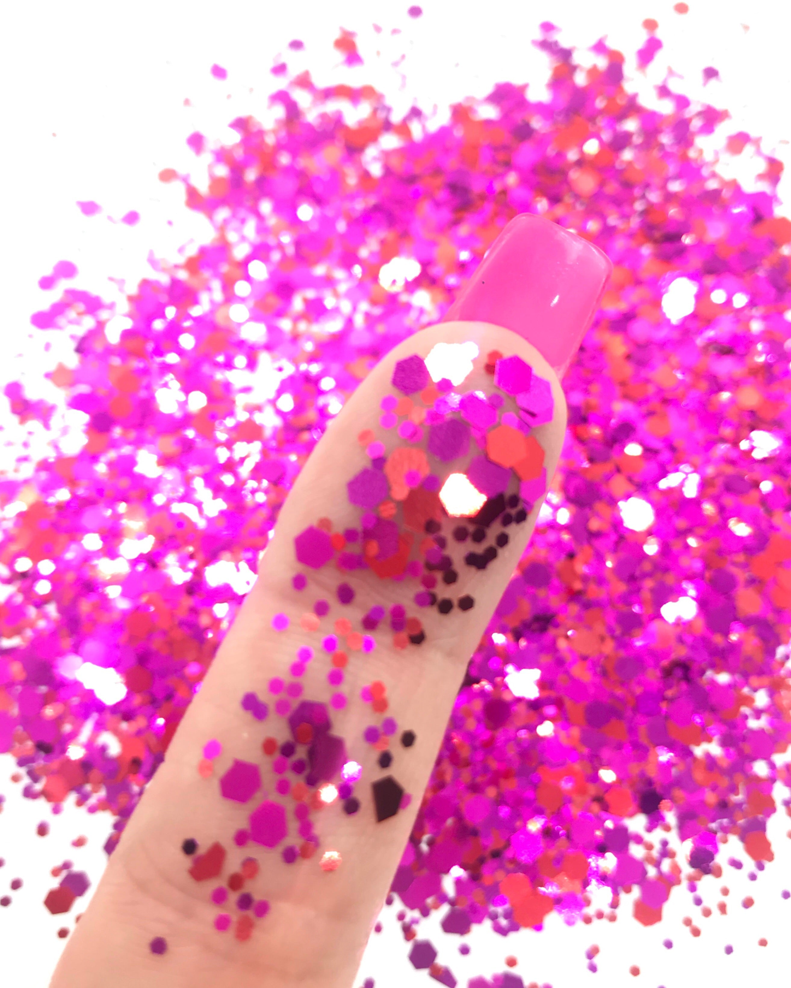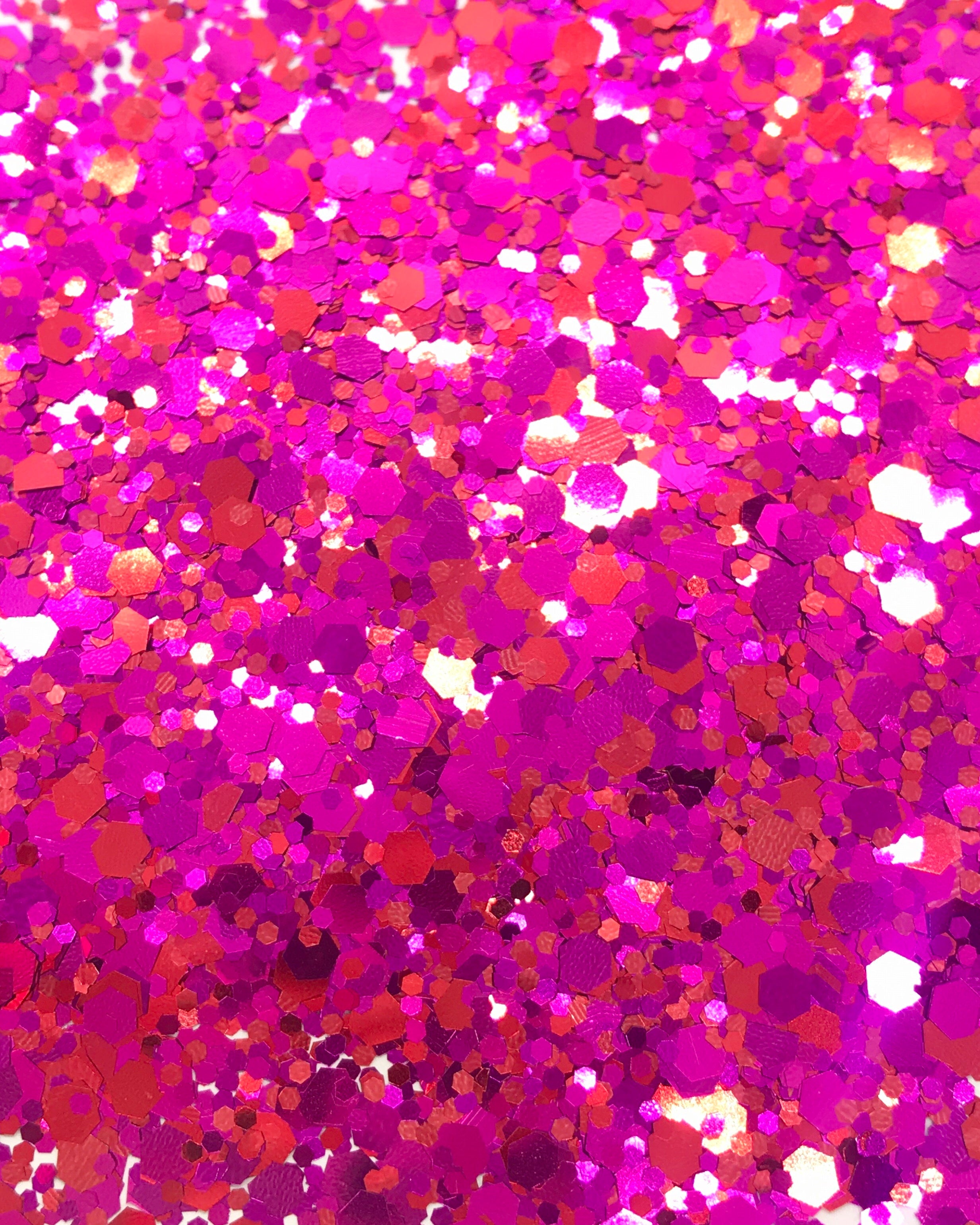 A MIX OF DIFFERENT FLAKE SIZES IN BEAUTIFUL PINK AND RED REFLECTIVE COLORS.