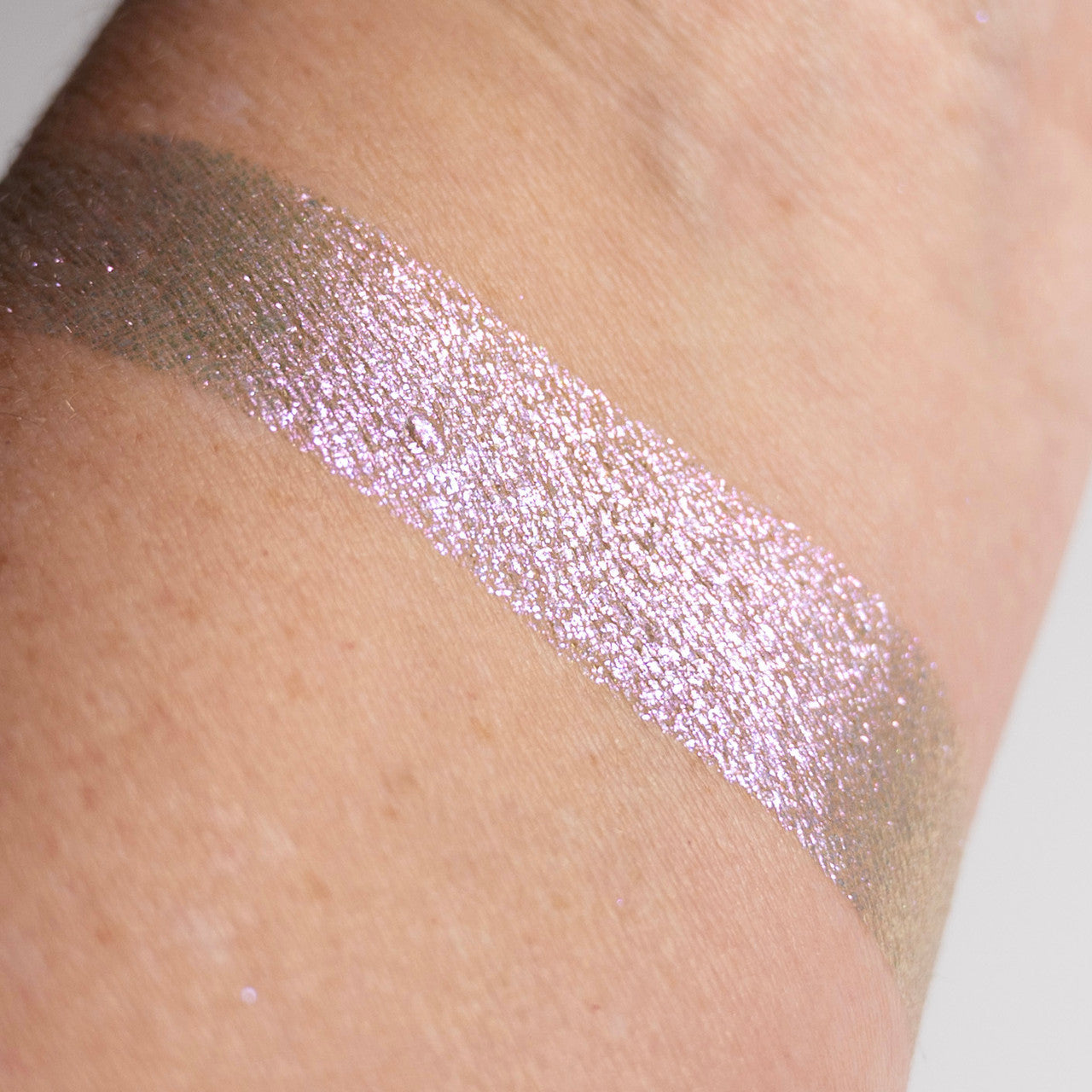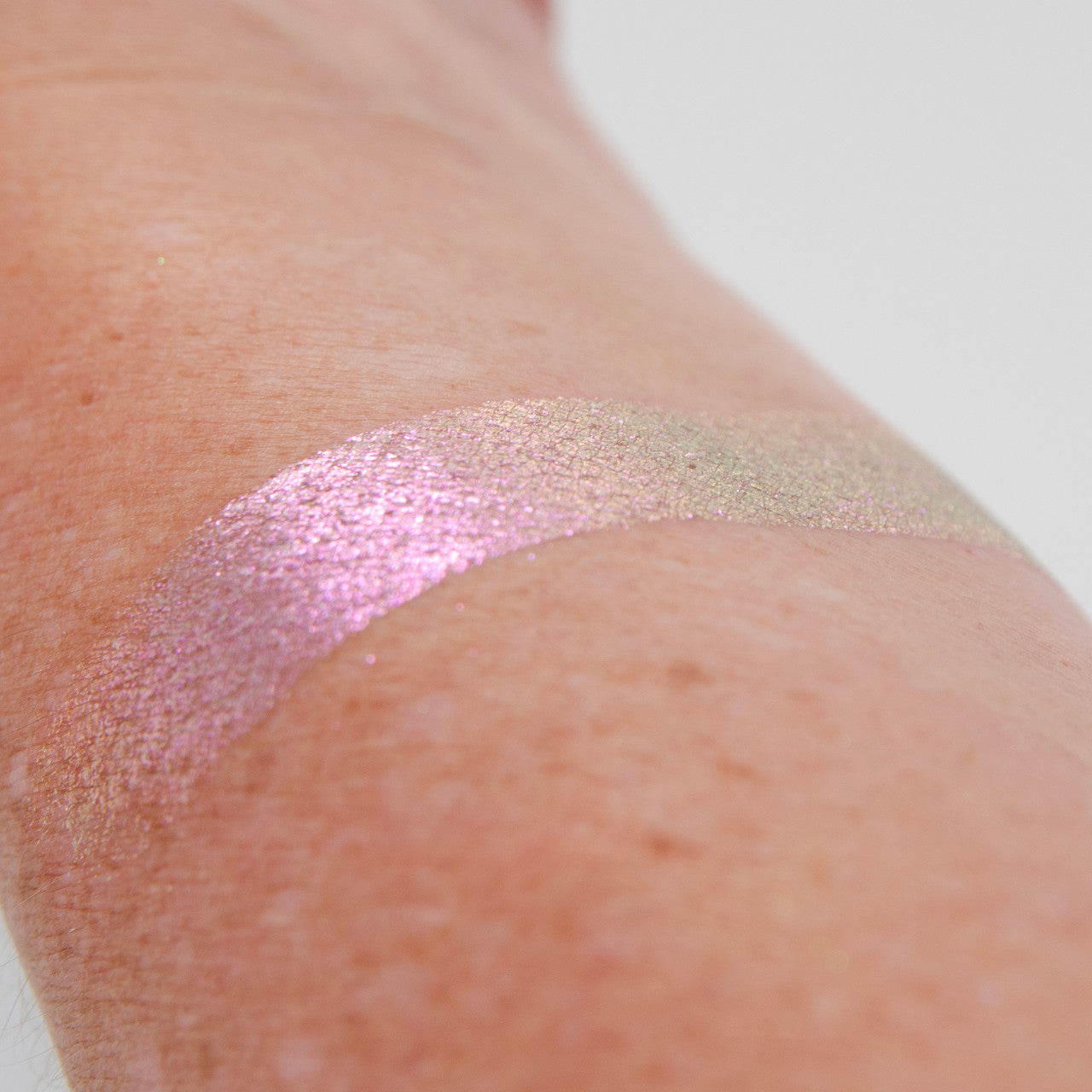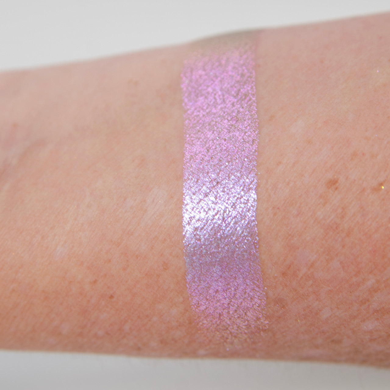 Birthday Girl is a sheer multi-chrome pressed pigment shadow that has shifts of lavender, pink, and yellow. The shift is most noticeable when put all over the eyelid so that the curvature of your eye will cause the shadow to shift.