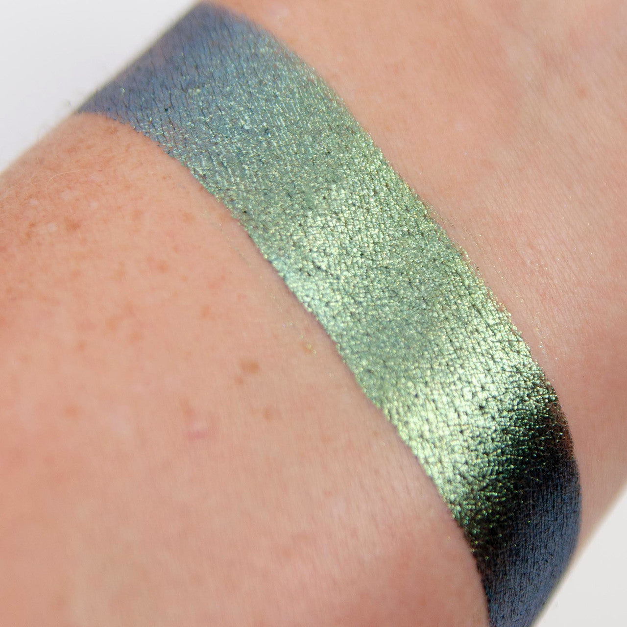 This multi-chrome will shift from a vibrant yellow gold to a hunter green and then to a dark sky blue. The shift is most noticeable when put all over the eyelid so that the curvature of your eye will cause the shadow to shift.