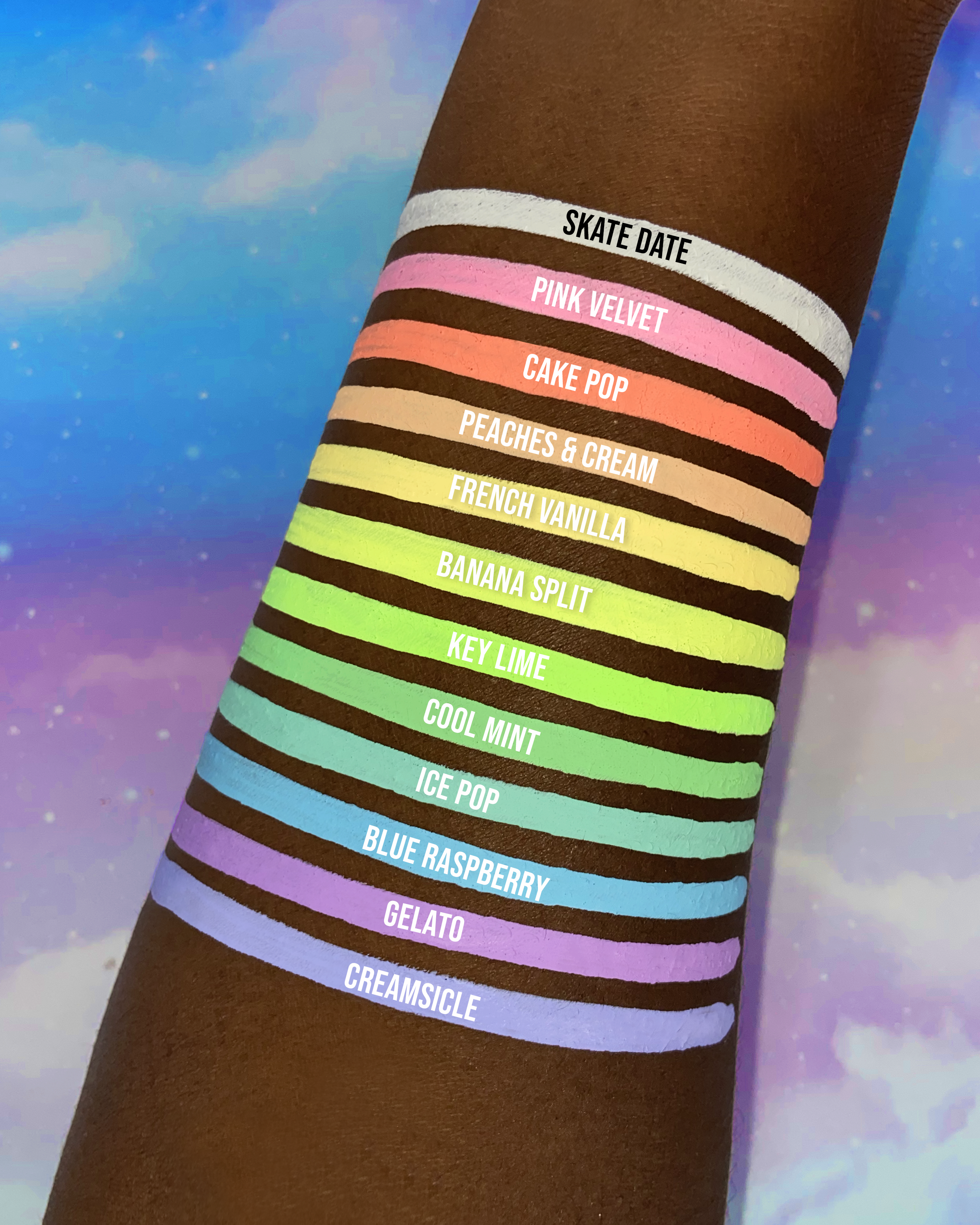 Our most iconic, best-selling collection! This ice cream themed collection includes 12 pastel Retro Liners: Skate Date (matte), Pink Velvet (UV), Cake Pop (UV), Peaches & Cream (UV), French Vanilla (UV), Banana Split (UV), Key Lime (UV), Cool Mint (UV), Ice Pop (UV), Blue Raspberry (UV), Creamsicle (UV), and Gelato (UV). Also includes one GV16 liner brush and one fine mist spray bottle!
